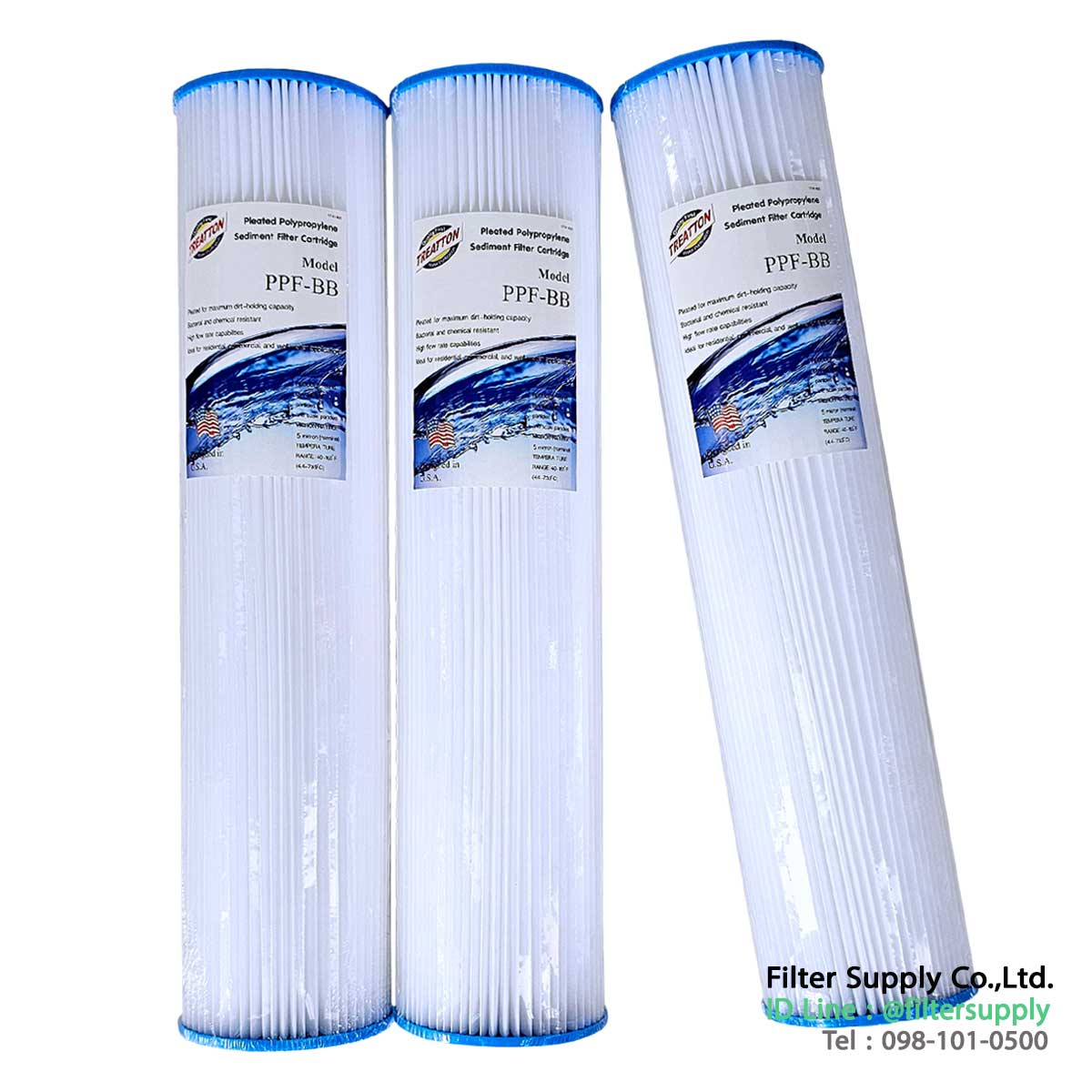 ไส้กรองน้ำ แบบจีบ BigBlue Treatton ขนาด 20 นิ้ว 5 ไมครอน ไส้กรองน้ำบิ๊กบลู แบบจีบ เป็นไส้กรองทำจากแผ่นกรองที่ทำจาก Polyester พับเป็นจีบ พันกันเป็นทรงกระบอก รอบแกนกลางที่ทำมาจาก PP มีรูพรุนขนาด 5 ไมครอน ไส้กรองรุ่น BB (Big Blue) มีขนาดเส้นผ่านศูนย์กลางภายนอกประมาณ 4.5″ (114 mm) มีความยาว 20″ (508 mm) สำหรับกรองตะกอนขนาดใหญ่ และเล็กในน้ำ ไส้ออกแบบมาให้เป็นแบบจีบเพื่อกว่าสามารถในการกรองที่รวดเร็วขึ้น และสามารถรับตะกอนในน้ำได้มากขึ้น เพราะมีพื้นที่รับน้ำมากขึ้นตามแนวจีบของไส้กรอง