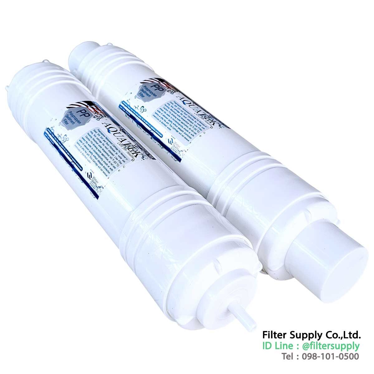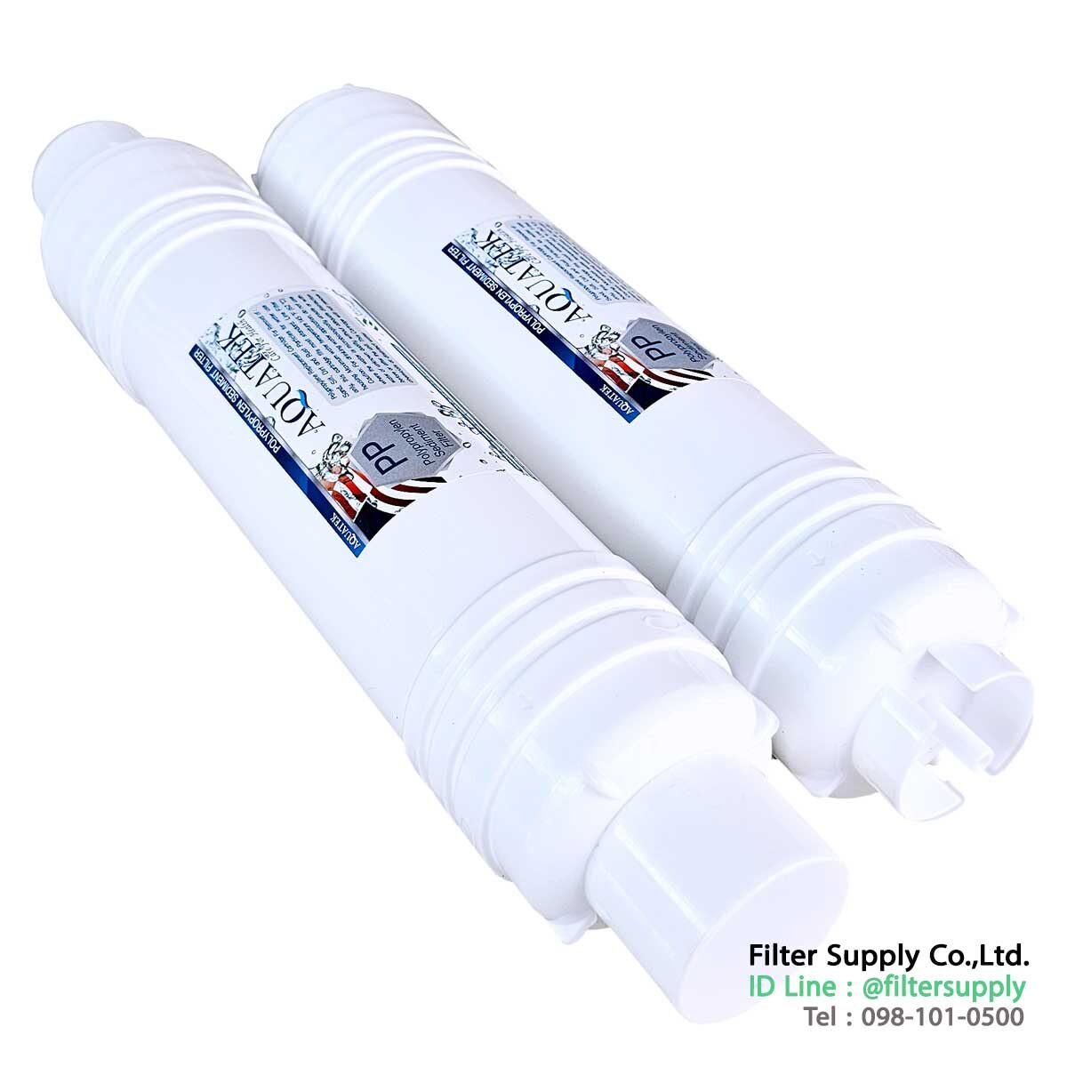 ไส้กรองน้ำ Inline i Type Sediment PP Aquatek Silver ขนาด 12 นิ้ว ไส้กรองรุ่นนี้จะใส่กับเครื่องกรองน้ำแบบกล่อง มีฝาครอบได้หลายยี่ห้อมากครับ ถ้าอะไหล่มีความคล้ายกันสามารถไส่ด้วยกันได้หมดครับ ถ้าต้องการดูวิธีการเรียง สามารถดูได้จากรูป เครื่องกรองน้ำ Aquatek Silver AM-100 ได้เลยครับ เป็นไส้กรองตัวเดียวกัน เป็นไส้กรอง Sediment (PP) บรรจุภายในกระบอกกรองสีขาวที่ทำด้วยพลาสติก สามารถต่อกับ Fitting ชนิด 0404 ได้เลย โดยไม่ต้องนำไปบรรจุใน Housing เหมาะที่จะใช้บรรจุในตู้น้ำที่มีพื้นที่จำกัด ทำหน้าที่กรองตะกอน สารแขวนลอยขนาดเล็ก ให้ไม่สามารถหลุดผ่านมากับน้ำที่กรองได้ ใช้หลักการกรอง Depth Filter (ตามชั้นความลึก) ทะลุผ่านรอบด้าน ไส้กรองน้ำมี ลักษณะเป็นเส้นใยสีขาว ทำจากวัสดุโพลีโพรพีลีน (PP) พันกันเป็นทรงกระบอก อัดแน่นจนเป็นเนื้อเดียวกัน ผิวด้านนอกไส้กรองมีลักษณะเรียบ มีรูพรุนขนาด 5 ไมครอน ไส้กรองมีขนาด 2.5″ x 12″ สินค้าผลิตในประเทศเกาหลีใต้